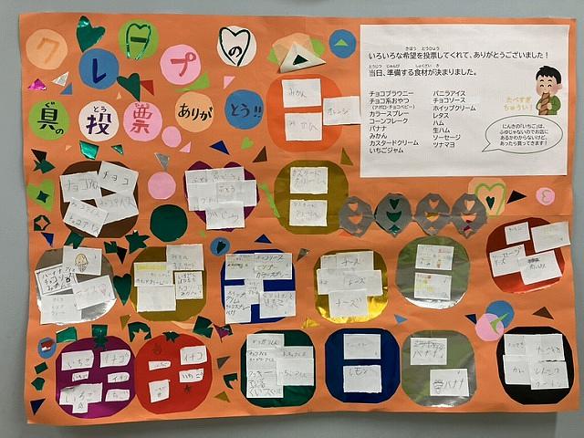 事前に実施した子どもたちとの打ち合わせでは、「どんなクレープを作りたいか」を相談し、子どもたちから食材の希望を募ることとなりました。期間を設けて「投票箱」に希望の食材を子どもたちが思い思いに投票し、その中から計14種類のトッピングを用意することに決定。例えば、「ハムを入れたクレープも作れるように、ロースハム準備しようか?」と職員が提案したところ、「(ロースハムじゃなくて)生ハムを入れたい!」「生ハムおいしいんだよ!」「ロースハムも要る」という意見も子どもたちから出て、「生ハム」と「通常のハム」の2種類を用意するなど、子どもたちの希望が実現できました。