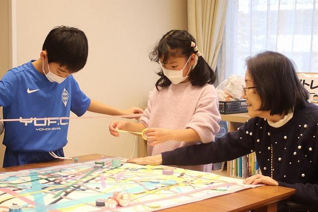一緒に制作をした時間は短かったのですが、ご入居者さまの細かい作業に子どもたちが驚いたり、ご入居者さまが「とっても上手!」と子どもたちを応援してくださったりと、和やかな時間となりました。